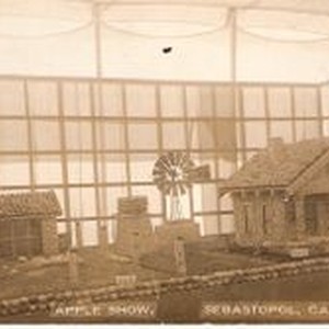 Postcards--two--black and white photos of same display--Gravenstein Apple Show 1911. Display of farm house, windmill, well and chicken coop covered in whole and dried apples. Live chickens in front of coop. Kauffman and Arnold sign in top right corner-adjacent exhibit. Caption on both postcards: Sebastopol, Cal Gravenstein Apple Show 1911."