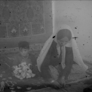 Image / Unidentified woman and child in traditional clothing seated on a carpet