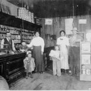 Photo--sepia: Interior of general store and fish market in Sebastopol owned by Marc and Margaret Smith Buvelot circa 1910s. Marc and Margaret, married in 1909, are seen on the left with their two children. Marc a Swiss immigrant and Margaret, daughter of William Smith a Bodega Bay Miwok elder, worked together in their store