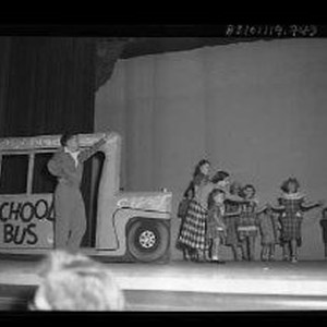 SERIES. Group of young girls dressed in school clothes playing with a school bus stage prop in the background. Man and woman models with small dog.