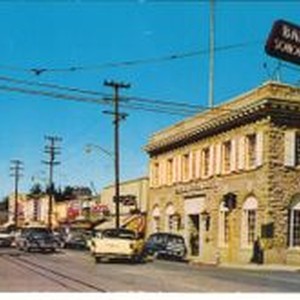 Postcard, photo--color: Downtown Sebastopol, corner with Bank of Sonoma County, late 1950s. Business down street: Medico Drugs, Bakers, Borba Stationery, caf. 1950s era cars. Background: The Bank of Sonoma County was previously the Analy Savings Bank about 1906.