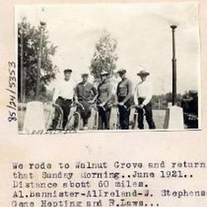 Cyclists Gene Hepting, Al Bannister, Al Ireland, W. Stephens and R. Laws on a cycling trip to Walnut Grove, California