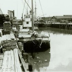 SERIES. Sailing ship, "Undine," parked at loading dock. Series includes views of lumber stacked on dock, side of ship, deck, cabin, sails, and a ceremony on the deck.