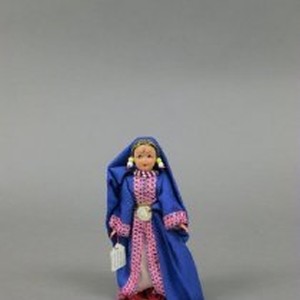 Female doll with tag: "Wealthy Woman of Southern Morocco." wearing blue cotton dress with pink detail and beaded necklace and earrings. Plastic body mounted on wooden square.
