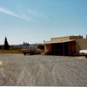 Photo--color: Don and Marcia Hallberg's Fruit Stand 1975 on Gravenstein Highway North. The stand was made from an old garage. Don and his daughter Donna built the door to the stand. The Hallbergs sold apple products at their stand.