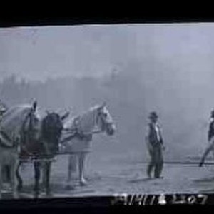 Three horses hitched to a fire engine. Several men are standing in the street in front of the horses. The air around the men and horses is smoke-filled. Through the smoke can be seen a man standing on a ladder against a house. Original envelope marked "Fire Horses"