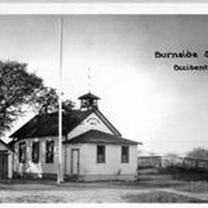 Photo--black and white: Burnside School, a one-room wooden country school built in 1863. . Picture from "Wooden School Houses of Sonoma County" booklet by Mike Carey and his Yulupa School Third Graders, 1975.