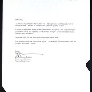 Gloria Johnson Rodgers (Gwendolyn Wilkes Rainbow Center, 2201 Buena Vista Road, Post Office Box 1580, Columbus, Georgia 31902), letter, [s.d.], to Glenda Goodson. [Description English/roman)]