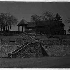 An unidentified rock building with a rock wall and stairs in front.
