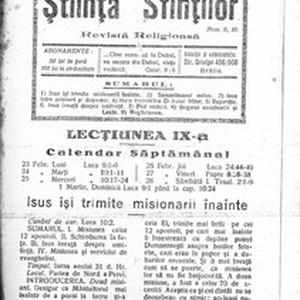 The Science of Saints is a periodical publication who contain biblical lessons, published by the biggest romanian penticostal group between 1930&1931. [Description English/roman)] Ştiinţa Sfinţilor este o publicatie periodica în care sunt publicate lecţii biblice de către grupul penticostal majoritar din Romania intre anii 1930-1931. [Description (original non-English/roman language/script)]