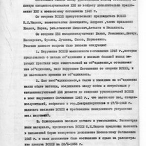 The document contains talks between leaders of AUECB and representatives of nonregistered communities of CFE. Yakov Ivanovich Zhidkov, Aleksei Leonidovich Andreev, Levindanto, Karev, Ivanov, A.I. Mitskevich, Astakhov and N.N. Mel'nikov represented AUECB. Bidash, Romanenko, Levchuk, Kasperovich, Frolov, Luchinets, Sizov and Korkosenko represented CFE. The issues of violation of the "August Agreement" and additions to the articles of Moscow agreements of 1945 were raised. The talk took place in Moscow on 31 October 1956. [Description English/roman)] Документ беседы между руководителями ВСЕХБ и представителями не зарегистрированых общин ХВЕ. Со стороны ВСЕХБ присутствавали Жидков, Алексей Леонидович Андреев, Левинданто, Александр Васильевич Карев, Иванов, А.И. Мицкевич, Астахов и Н.Н. Мельников. Со стороны ХВЕ: Бидаш, Романенко, Левчук, Касперович, Фролов, Лучинец, Сизов и Коркосенко. На совещании подымался вопрос о нарушениях «Августовского соглашения» также подымался вопрос о дополнениях к статьям Московских соглашений 1945 года. Беседа проходила 31 октября 1956 года в Москве. [Description (original non-English/roman language/script)]