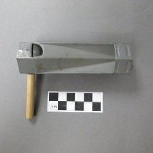 Noisemaker, ratchet type. Grey painted metal with plain wood handle. No maker's mark.