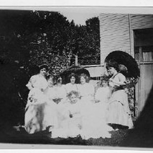 Exterior view of Mistletoe Club group of women. Donor's sisters are among these women, Myrtle Chamberlain and Ethel Beach.