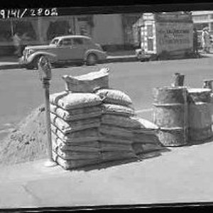 Eighteen bags of cement stacked on a street curb. This is probably part of the construction shown in 2800 - 2801 in front of Coast Radio appliance store at 900 J Street in the Ruhstaller Building.
