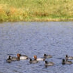Two male redheads and eight coots sitting in an area of water at Glen Helen Regional Park.