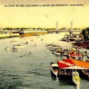 Boathouses on the Sacramento River near Tower Bridge, many boats in water surround them.