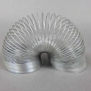 Grey metal slinky toy, made from one flat piece of metal coiled around itself numerous times to form a flexible cylinder.