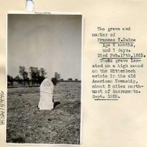 The gravestone of Frances T. Raine-----------grave located on the Wittenbach estate in the American Township 5 miles northwest of Sacramento.