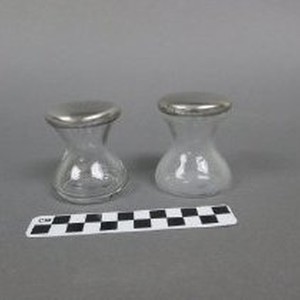 A set of (a) salt and (b) pepper shakers made of clear, molded glass with perforated metal (c&d) caps.