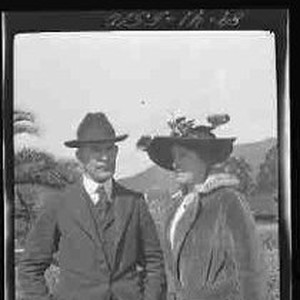 A man and woman identified as "Bill & Effie" posed standing in an outdoor setting. Original container identification "Bill & Effie San Luis"