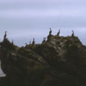 Cormorants perched on a large rock outcropping.