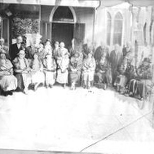 Photo--black and white: The Golden Wedding Club gathering, photo taken at the entrance to the Congregation Church on South Main Street in Sebastopol, about 1930's. A group of elderly men and women, most of the women seated and the men behind. At the far right of the rear row is George R. Harrison, past master of the California State Grange, and fourth from the right in the rear row was the Rev. George E. (Dad) Atkinson, Congregational minister. Others are unidentified. Also 1971 Sebastopol Times article "As we were. . . " with same photograph and several people identified.