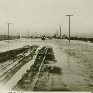 SERIES. View of a rutted dirt road almost covered by water. Horsedrawn wagon in distance.