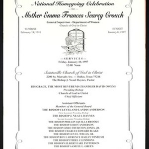 Memorial service program, Emma Frances Searcy Crouch, Saintsville Church of God in Christ, Dallas, Texas, 1997 January 10. 14 pages. [Description English/roman)]