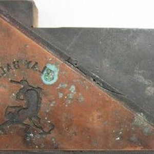 Triangular copper print palte depicting a batter and either a catcher or umpire. Caption reads: "PLAY BALL." Orange paper on backside of wood block reads: "Capitol Printing Co. Inc. Williamsport 8, PA"