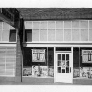 Exterior view of the Old Home Bakers company makers of Old Home and Betsy Ross Bread with a window display showing the Freer Trophy.