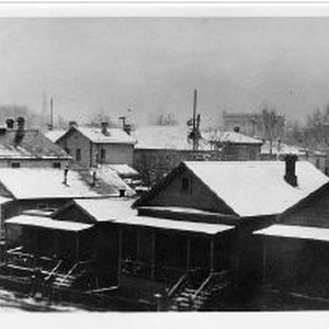 Copy Print: View of a rare snow storm in Sacramento. This view is taken from 6th and 7th Streets on E Street looking south. the county courthouse is in the background