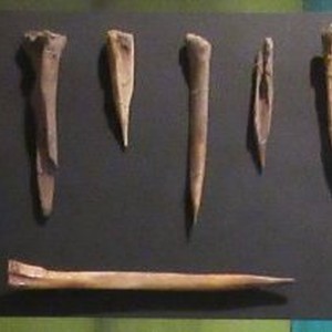 Wooden cigar box containing seven bone basket awls, removed from the Fremont mound.