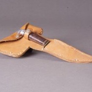 Knife with leather sheath (a/b). Sheath has metal rivets and silver snaps with Boy Scout logo. Knife handle has faux-wood decoration. Produced by Boy Scouts of America.