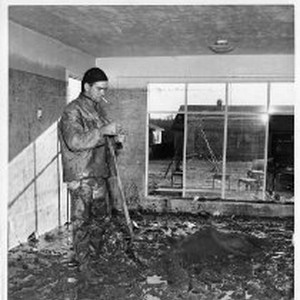 A worker takes a break from cleaning up 4 inches of mud inside a building on Park Avenue in Yuba City.