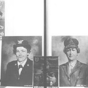 SERIES. Window display promotes war bonds and women in the armed services. Four large posters of women officers, 3 names visible: Captain Mildred H. McAfee, Colonel Ruth Cheney Streeter, and Colonel Oveta Culp Hobby.