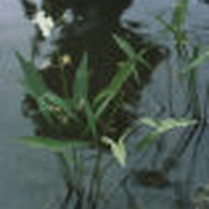 Tall green stalks emerging from water, with a white flower on one, at the Delaware and Raritan Canal in New Jersey.