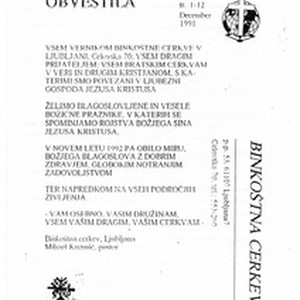 Bilten Kristove pentekostalne crkve u Ljubljani. Broj iz prosinca 1990. godine koji sadrži kratak uvodnik, a zatim izvješća o tome što se događalo u crkvi tijekom studenoga i obavijesti o tome što će se događati u crkvi tijekom prosinca 1990. i siječnja 1991. [Description (original non-English/roman language/script)] Bulletin of the Christ's Pentecostal Church in Ljubljana for December, 1990, containing an editorial, report on what went on in the church during November and the notices what will be been happening in the church in December 1990 and January 1991. [Description English/roman)]