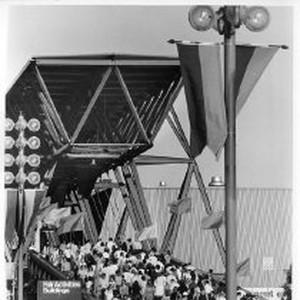 Crowd of people crossing bridge to the fair activities buildings at Cal Expo.