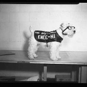 SERIES Views of terrier dog on a table wearing shirt and sunglasses. The shirt reads The BEE-KBEE KNEE-HI.