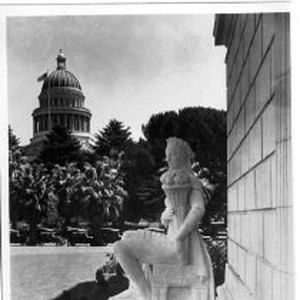 View of the Statue "Floral Wealth" by Edward Field Sanford, Jr. at the entrance of the California State Library. California State Capitol in the background.