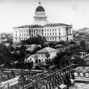 Copy of old photo. View of the California State Capitol building from 2 blocks away and looking southeast.