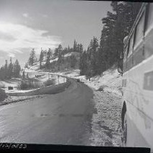 Snow scene along mountain highway. Greyhound bus beside road. ca.1950