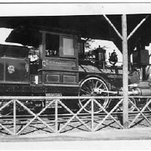 Exterior view of the Southern Pacific Railroad Company's earliest locomotive, the C. P. Huntington on display in 1935.