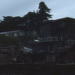 Small industrial building with small boats stacked up and a small crane, with yellow house next door.
