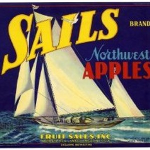 Crate lug label (2 of same label.) Sails Brand Northwest Apples, Fruit Sales, Inc., Exclusive Distributors, Wenatchee, Washington, U.S.A. Image of beautiful sailboat on open seas.