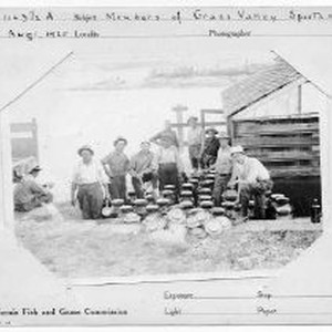 Photographs from Wild Legacy Book. 4 1/2 x 6 1/2 photo mounted on 61/2 x 81/2 card with description, from California Fish and Game Commission. "Members of Grass Valley Sportsmen's Club, Aug 1, 1925, [on back] planting fish"