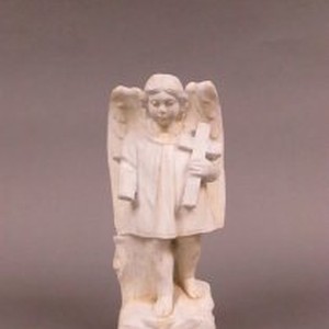 Carved white stone angel holding cross. Missing right hand.