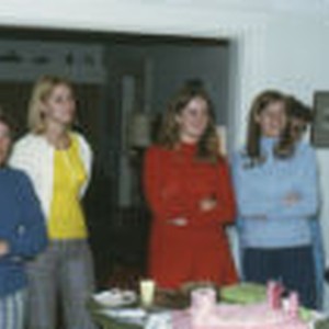 David, sitting in chair, and four women celebrating at a senior party for Pomona College students.