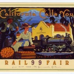 Artists rendering for the California Rail Fair, June 18-27, 1999 in Old Sacramento. Heading says, "California Calls You."
