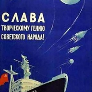 Soviet social poster. Caption reads, "Слава творческому гению советского народа! / Slava tvorcheskomu geniiu sovetskogo naroda!", meaning, "Glory to the creative genius of the soviet people!". [Description English/roman)]